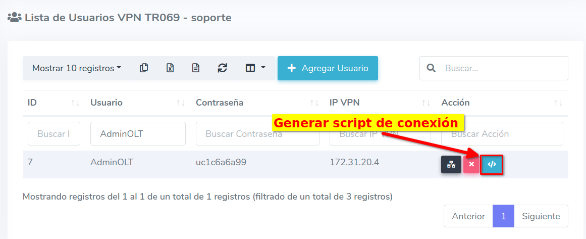1Para poder agregar un Usuario VPN TR069, debemos dirigirnos a la sección TR069 > Usuarios VPN y le damos click al botón Agregar Usuario.
