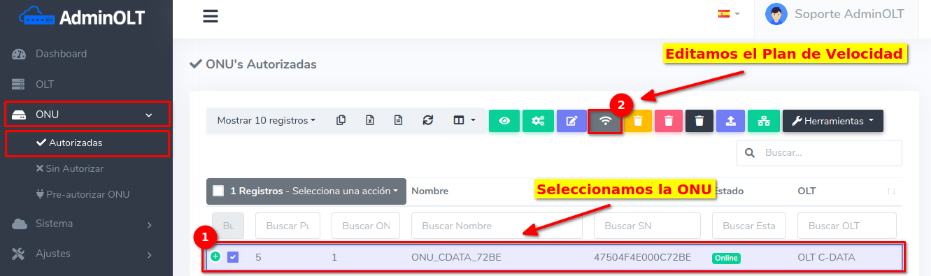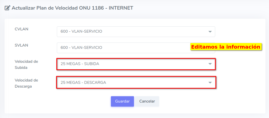 Para este ejemplo usaremos una ONU Autorizada que inicialmente tiene un Plan de 100 Megas, en este caso nosotros lo cambiaremos a un Plan de 25 Megas.