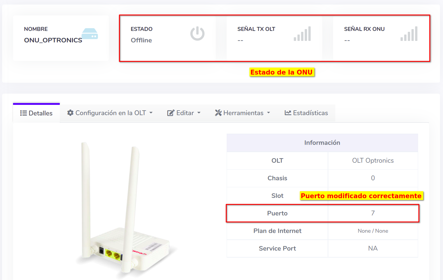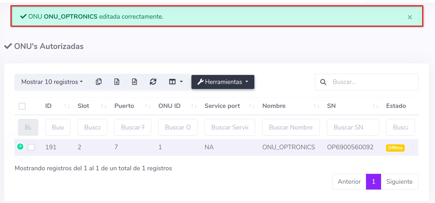 En este ejemplo la ONU se encuentra en en el Puerto 1; lo pasaremos al Puerto 7. Antes de editar verifique que la ONU cuente con servicio