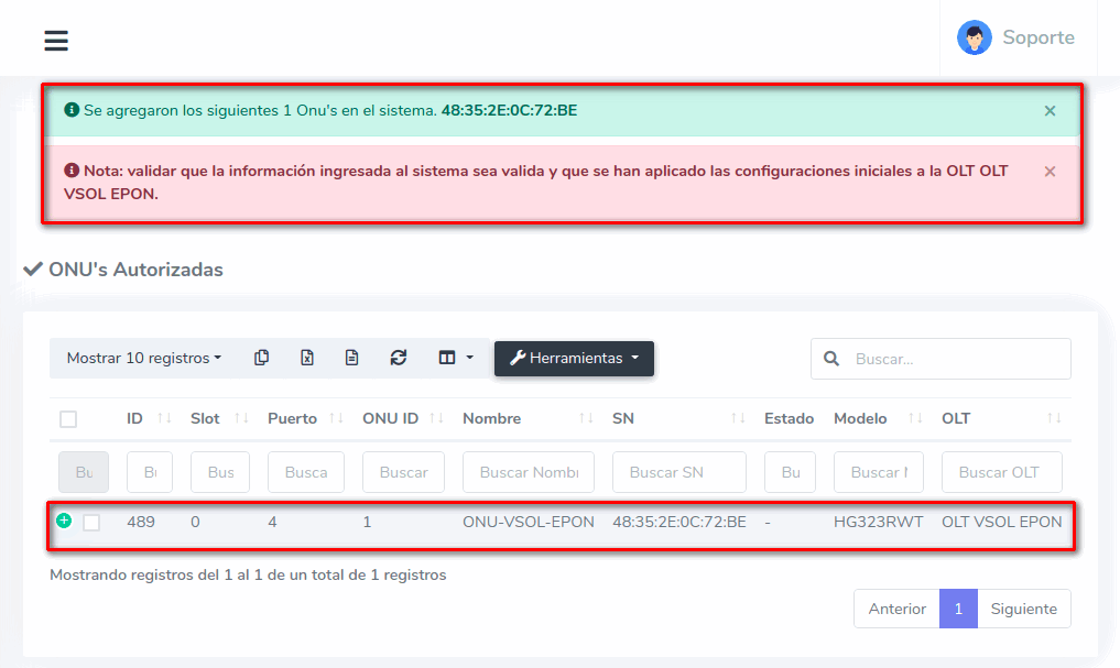 3Una vez que hayamos seleccionado los equipos, importamos las ONU's al sistema AdminOLT
