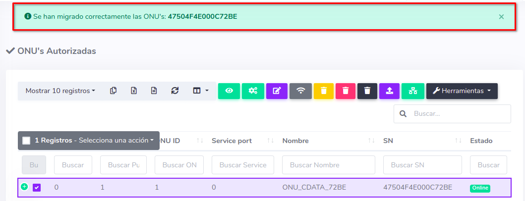 1 En ONU's > Lista de Onu's Autorizadas debemos escoger el equipo con el que se trabajará y seleccionar Migrar ONU a otra OLT que se encuentra en el botón con la leyenda Herramientas.