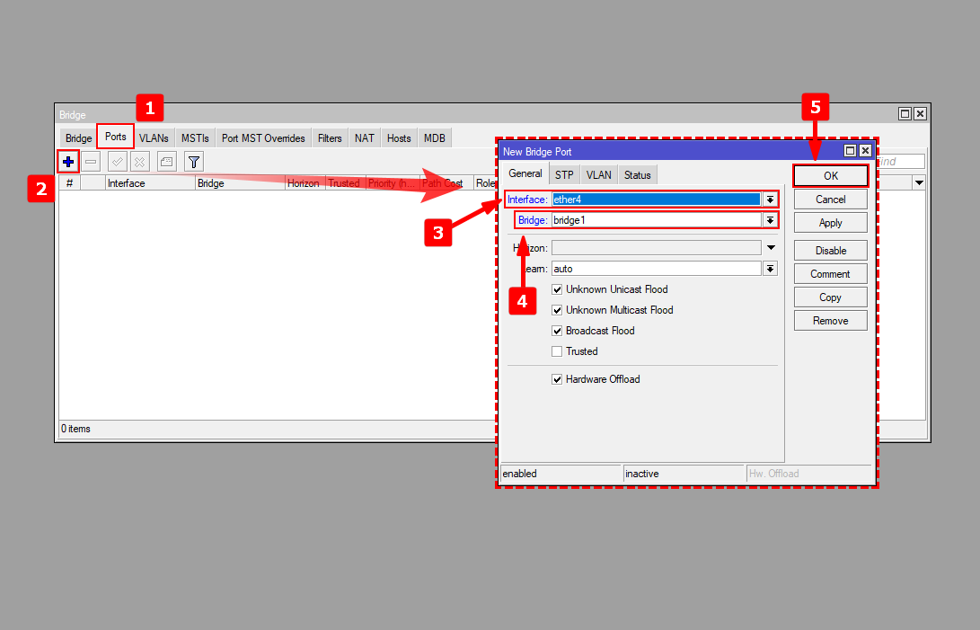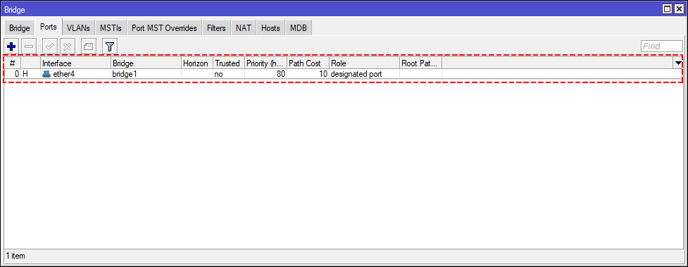 1 Nos dirigimos al apartado de Bridge en el menú de nuestro RouterBoard para generar la interfaz bridge1 y así poder agrupar los puertos que estarán trabajando en la red de la OLT.