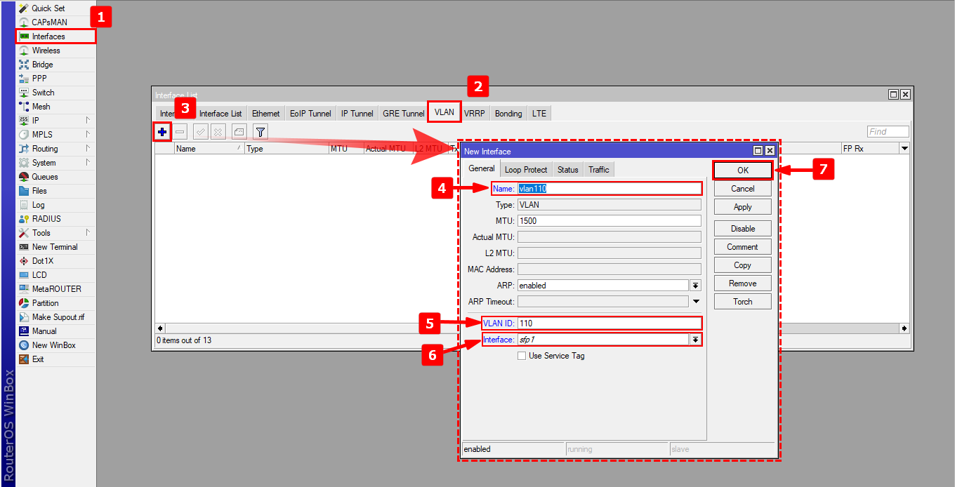 1Nos dirigimos las configuraciones de las interfaces y nos dirigimos al apartado de Vlan, donde crearemos una vlan con nombre vlan110 con ID 110,que será donde se creara la subred para los host.