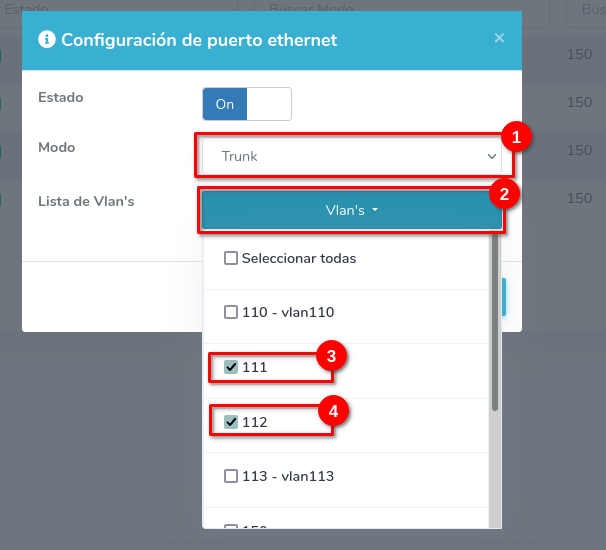 Coloque la opción modo en Trunk, seleccione las vlan's en la opcion Lista de Vlan's y guarde el cambio