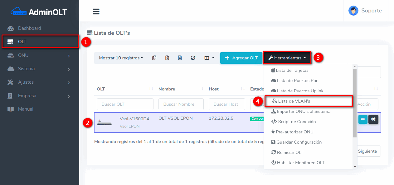 2 Después de agregar esta vlan en tu router, podremos agregarla en la OLT desde la Lista de OLT's seleccionando la OLT y la opción Lista de VLAN's.