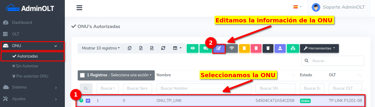 Pasos para editar información de ONU Autorizada en AdminOLT