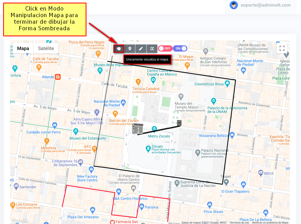 Una vez haya dibujado la Geozona que desea, para terminar de dibujar debemos dar click en la opción de Manipular Mapa.