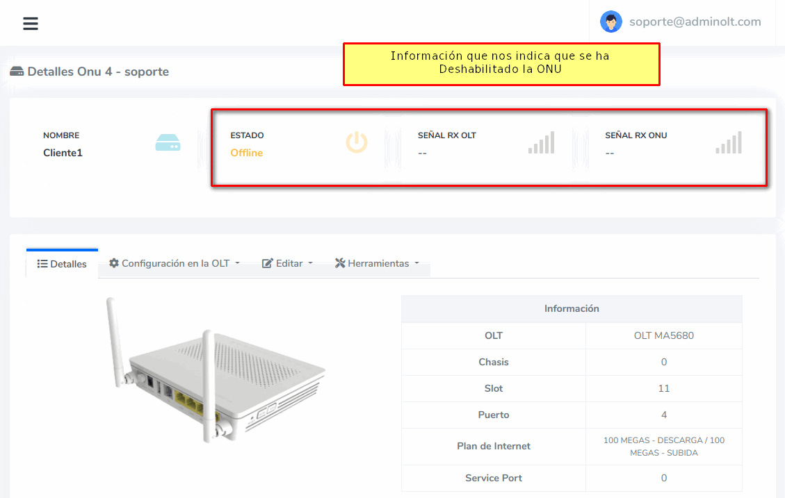 6 Una vez terminado el proceso, veremos que el Estado de la ONU sale en Offline lo que indica que se deshabilitado la ONU.