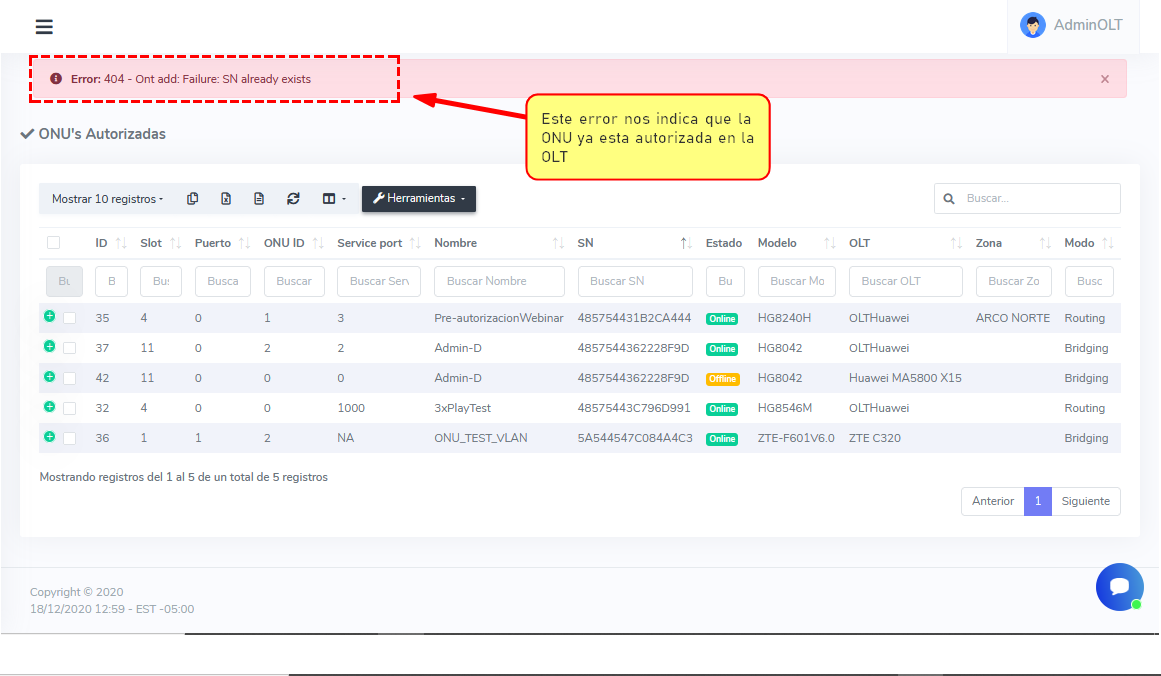 Si elimina la ONU de la lista de autorizadas y no de la OLT (es posible eliminar la ONU solo de AdminOLT y dejarla autorizada en la OLT), al intentar autorizar ese equipo nuevamente en algún otro puerto no sera posible, ya que la OLT ya tiene registrado el SN.