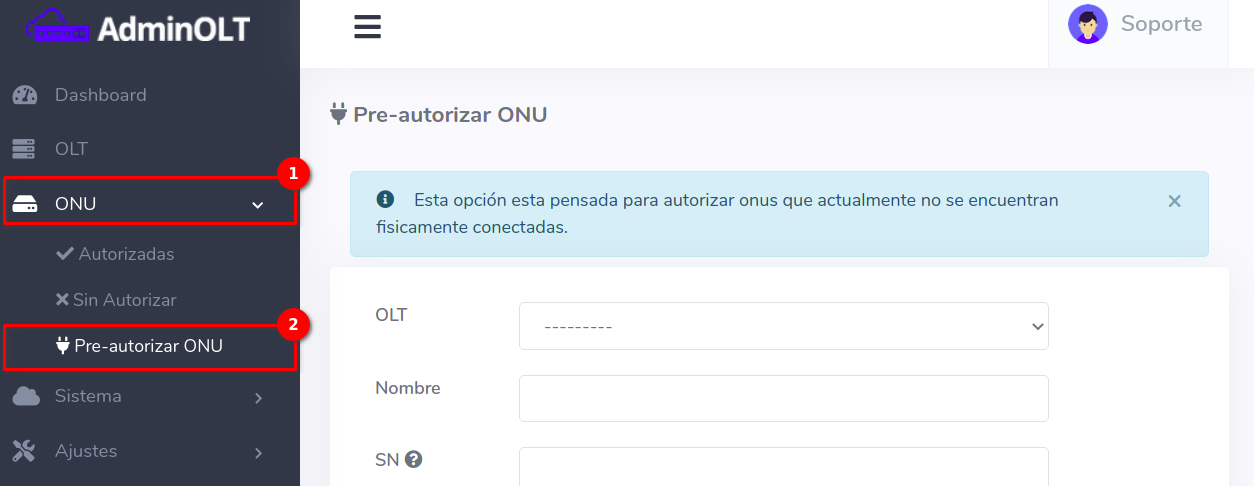 Se resume en la acción de autorizar utilizando el Numero de Serie (SN) de una ONU que no está conectada físicamente a la OLT. De esta forma, al momento de instalación, solo debe conectarse el equipo. Para realizar esta acción siga los siguientes pasos.