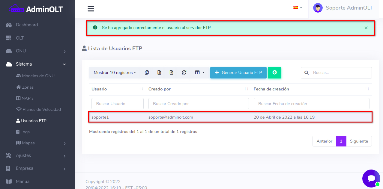 ¿Cómo creo un usuario FTP en el sistema AdminOLT?