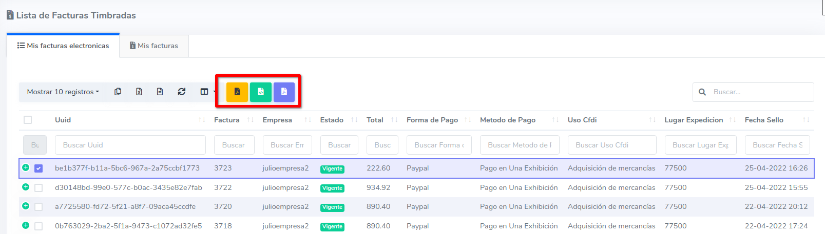 Tiene que seleccionar una factura para que aparezca el botón amarillo de generar factura electrónica.El cual lo redireccionará a la pantalla de timbrado.